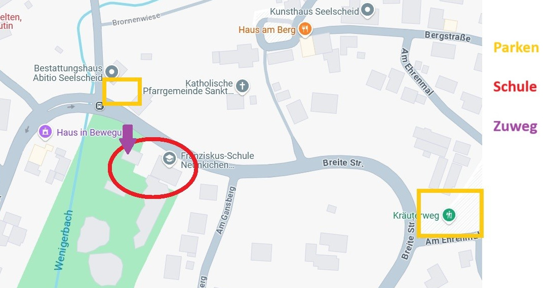 Parken könnt ihr gegenüber auf dem Parkplatz hinter der Bushaltestelle oder auf dem Wanderparkpatz Am Ehrenmal. Rechts neben dem Schulgelände führt eine Auffahrt an diesem vorbei. Ihr müsst ihr folgen bis zu einem Metalltor auf der linken Seite. Wir trainieren in dem blauen Nebengebäude, vor dem ihr jetzt steht. Drinnen einfach die Treppe hoch und im ersten Stock den Gang ganz durch, es ist der letzte Raum auf der rechten Seite. Wir werden den Weg am ersten Tag kennzeichnen!